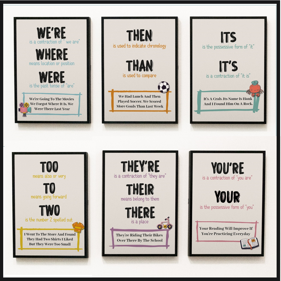 Featuring a diverse selection of commonly confused word pairs, such as "there," "their," and "they're," these visually appealing posters provide clear definitions, example sentences, and helpful illustrations to clarify each word's meaning and proper usage.